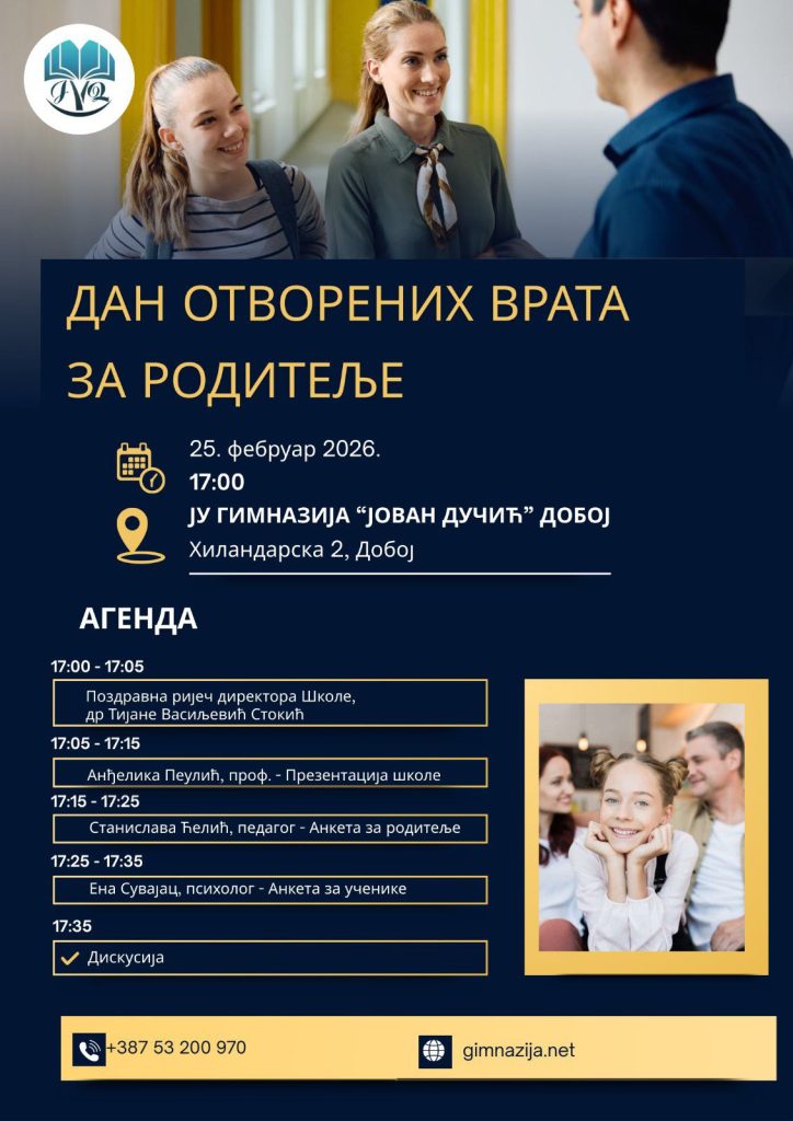 Dragi roditelji, vi koji ste najvažnija uloga u odrastanju naših učenika, na ovaj način ćete dobiti odgovore na sva vaša pitanja kada je riječ o školovanju u JU Gimnaziji “Jovan Dučić” Doboj kao i mogućnostima koja naša škola nudi.