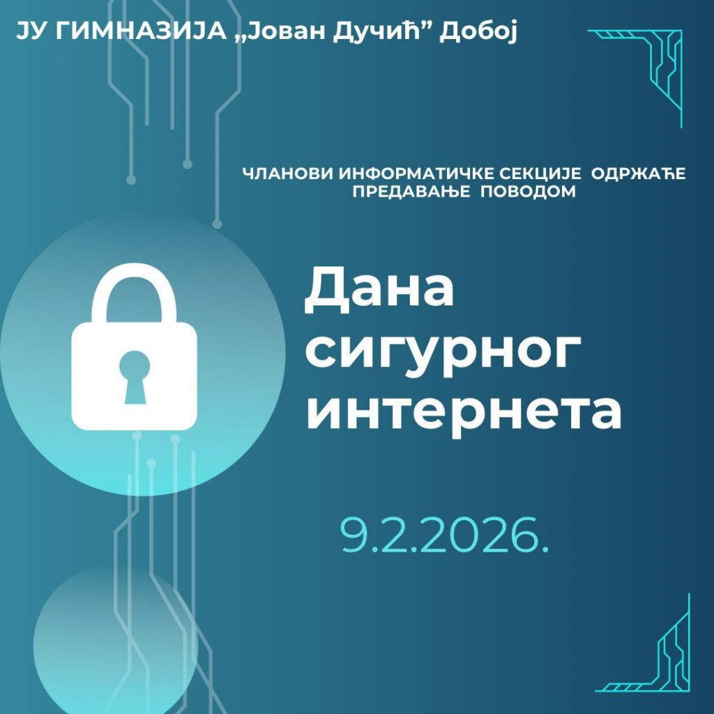 Iako nam donosi brojne prednosti, internet sa sobom nosi i određene rizike, naročito kada je riječ o sigurnosti i zaštiti ličnih podataka. Upravo zbog toga, 9. 2. u 12 časova, u JU Gimnaziji “Jovan Dučić” Doboj obilježavamo Dan sigurnog interneta, sa ciljem podizanja svijesti o odgovornom, sigurnom i pametnom korišćenju digitalnih tehnologija. Кroz prezentaciju podsjetićemo se zašto je važno biti oprezan na internetu i kako se možemo zaštititi u virtuelnom okruženju.