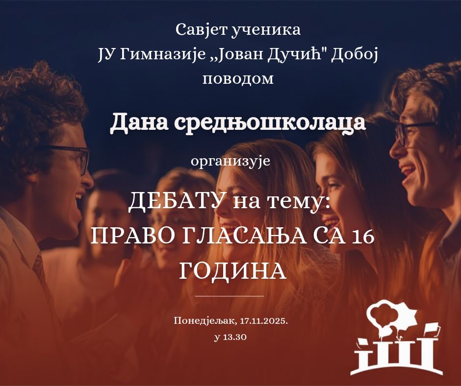 Tema debate će biti “Pravo na glasanje sa 16 godina”, a organizator je Savjet učenika Gimnazije “Jovan Dučić” Doboj. Debata će se održati u ponedjeljak, 17. novembra 2025. godine sa početkom u 13.30 časova.