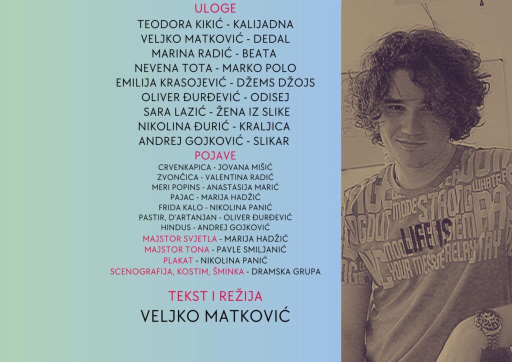 Tekst i režiju za predstavu “Dedalova radionica” potpisuje Veljko Matković, učenik četvrtog razreda Gimnazije “Jovan Dučić”. On sa svojim vršnjacima, mladim talentovanim entuzijastima, privodi kraju rad na predstavi zahvaljujući