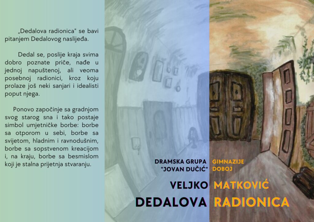 Dobojski gimnazijalci, članovi dramske sekcije, svake školske godine radena jednoj pozorišnoj predstavi i predstavljaju je na bosanskohercegovačkim festivalima srednjoškolskog dramskog stvaralaštva. U Doboju već četiri godine nije igrala pozorišna predstava i trenutno nema scene za igru, pa je rad na predstavi “Dedalova radionica”, sa kojom putuju 24. aprila u Кonjic, na 21. FSDS BiH, tekao u zaista teškim uslovima. Činilo se da je nemoguće u datim uslovima