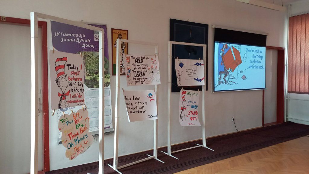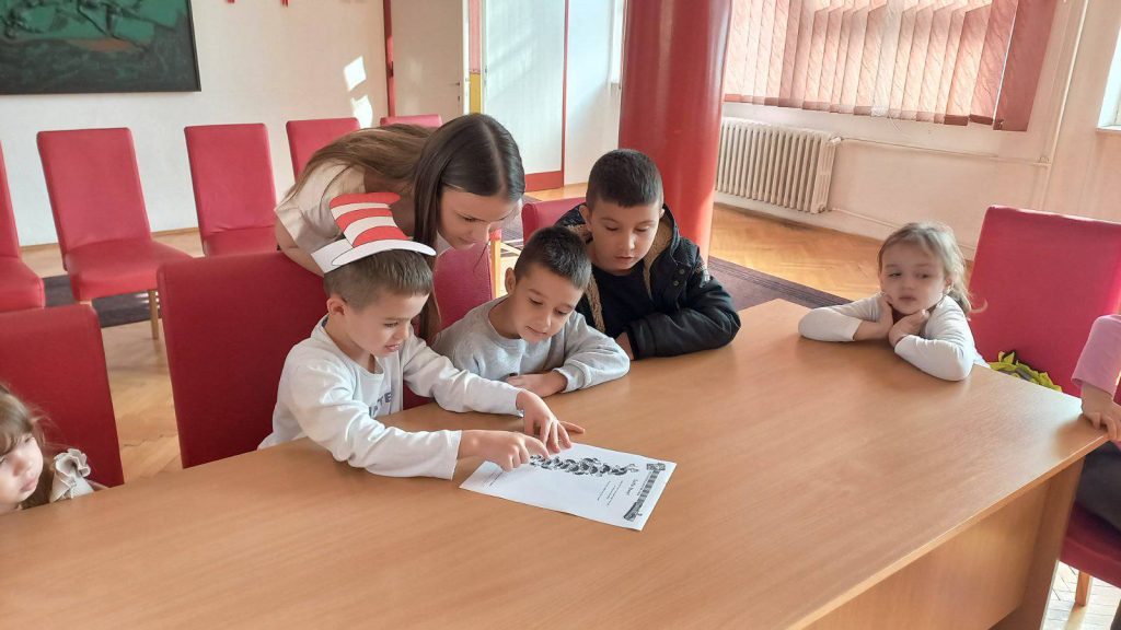 Stariji učenici su sa velikom pažnjom čitali priče, glumili omiljene likove i zajedno sa mališanima učestvovali u radionicama inspirisanim maštovitim svijetom Dr. Seuss-a. Smijeh i šarene ilustracije ispunili su učionicu, pokazujući koliko knjige mogu da povežu različite generacije.