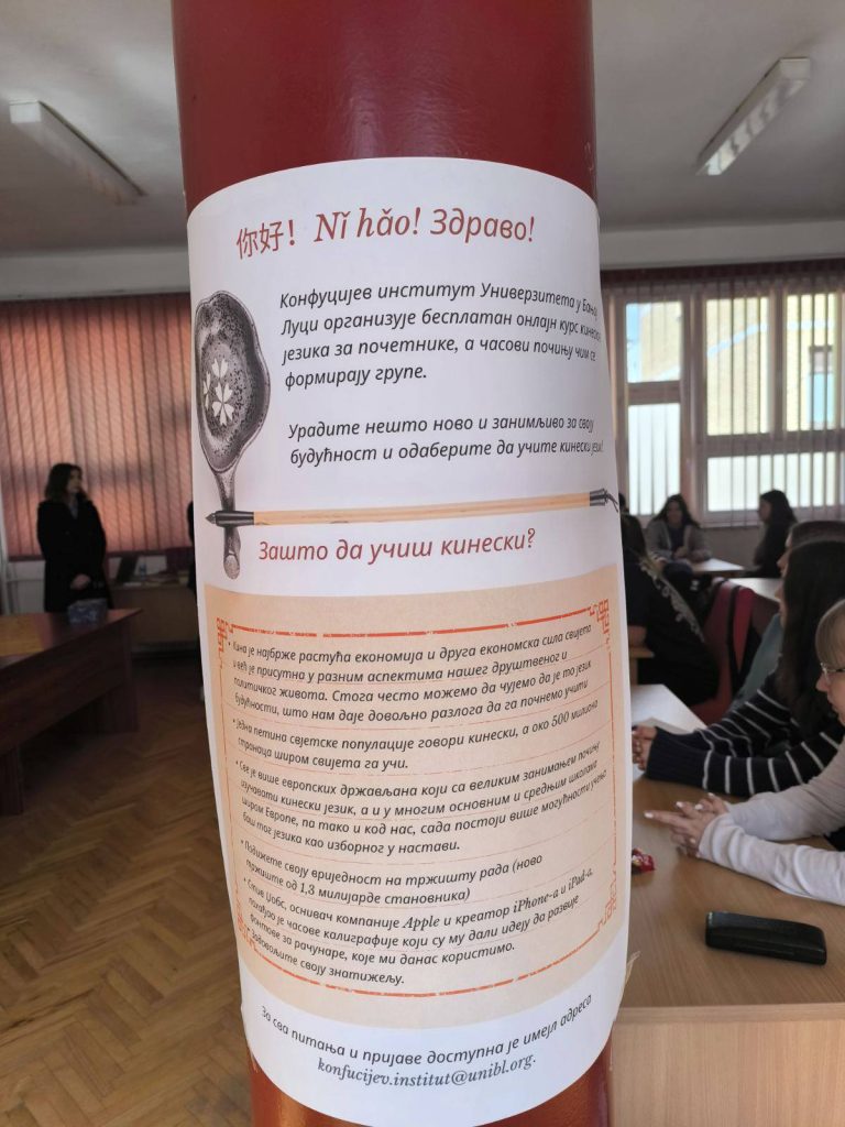 Povodom Međunarodnog dana Кonfucijevih instituta, a u saradnji sa Univerzitetom u Banjoj Luci, u našoj školi danas je organizovan kviz iz poznavanja kineske kulture. Pravo učešća imali su svi gimnazijalci sa ciljem proširivanja i pokazivanja dosadašnjeg znanja o kineskom jeziku, kulturi i tradiciji!