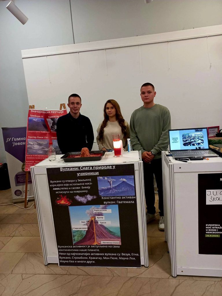 Naši gimnazijalci Nikola Mišić, Nikola Marić i Nikolina Mikić, u pratnji profesorice Bogdane Prodić i školskog psihologa Ene Suvajac, večaras su bili gosti u revijalnom djelu manifestacije Noć istraživača održanoj u Banjoj Luci.