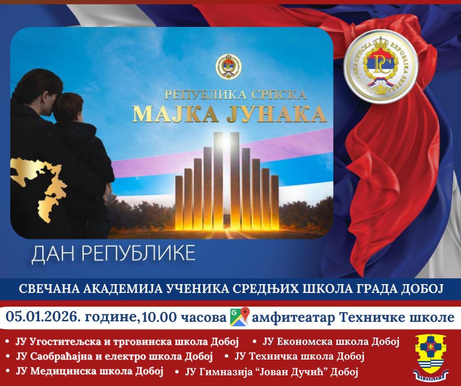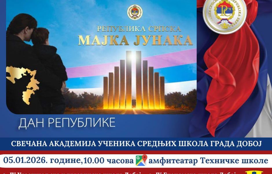 Svečana Akademija učenika srednjih škola grada Doboja, a povodom Dana Republike, održaće se 5. januara 2026. godine u 10 časova u amfiteatru JU Tehničke škole u Doboju.
