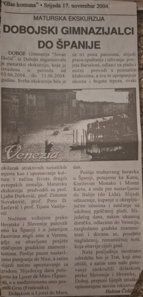 Članak je objavljen u ,,Glasu komuna”, a autor je učenica generacije školske 2004/2005. godine, Helena Čolić.